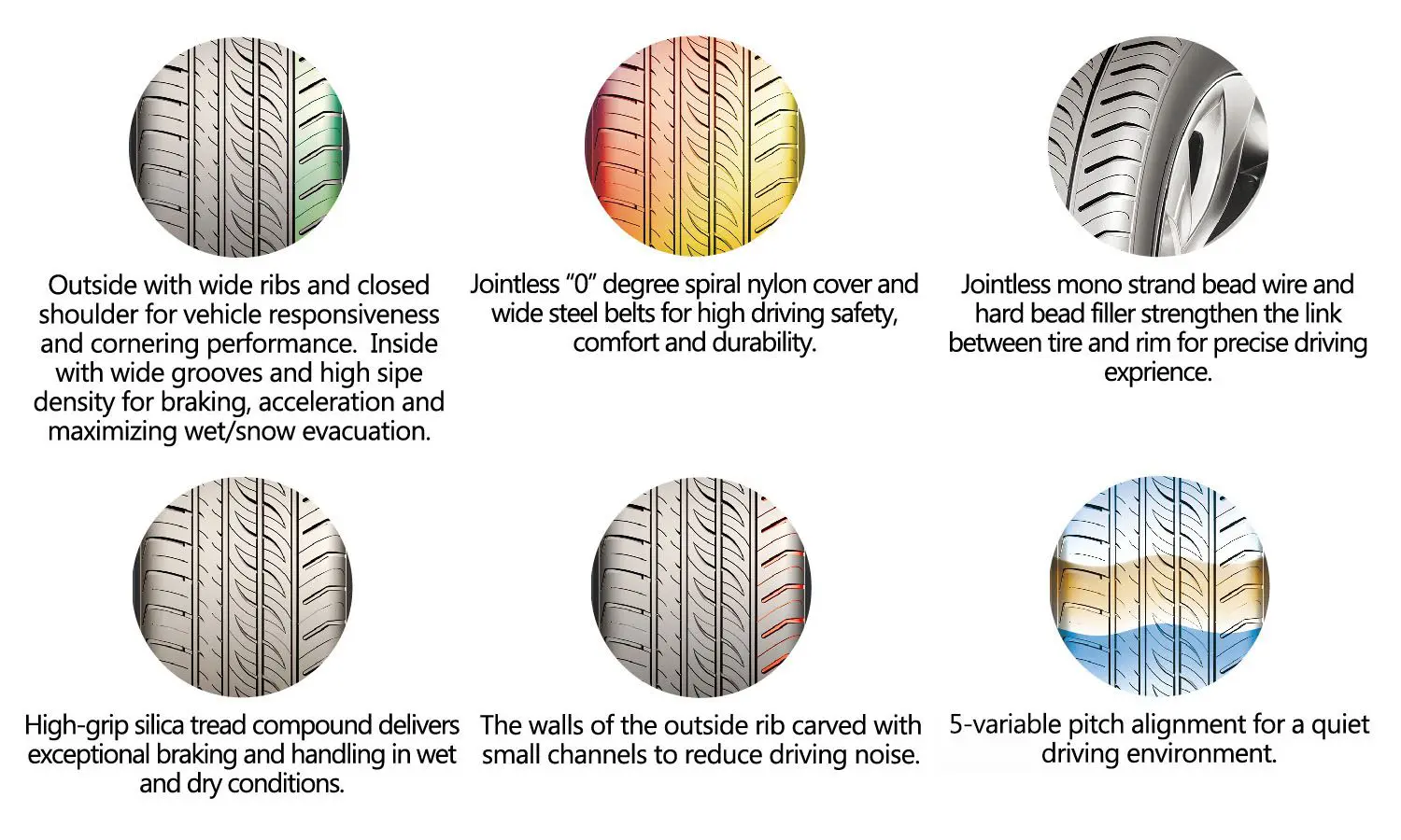 Outside with wide ribs and closed shoulder for vehicle responsiveness and cornering performance. Inside with wide grooves and high sipe density for brakinq, acceleration andwet/snow evacuation Jointless “0” degree spiral nylon cover and wide steel belts for high driving safety, comfort and durability Jointless mono strand bead wire and hard bead filler strengthen the link between tire and rim for precise driving experience. High-grip silica tread compound delivers exceptional braking and handling in wet and dry conditions. The walls of the outside rib carved with small channels to reduce driving noise. 5-variable pitch alignment for a quiet.