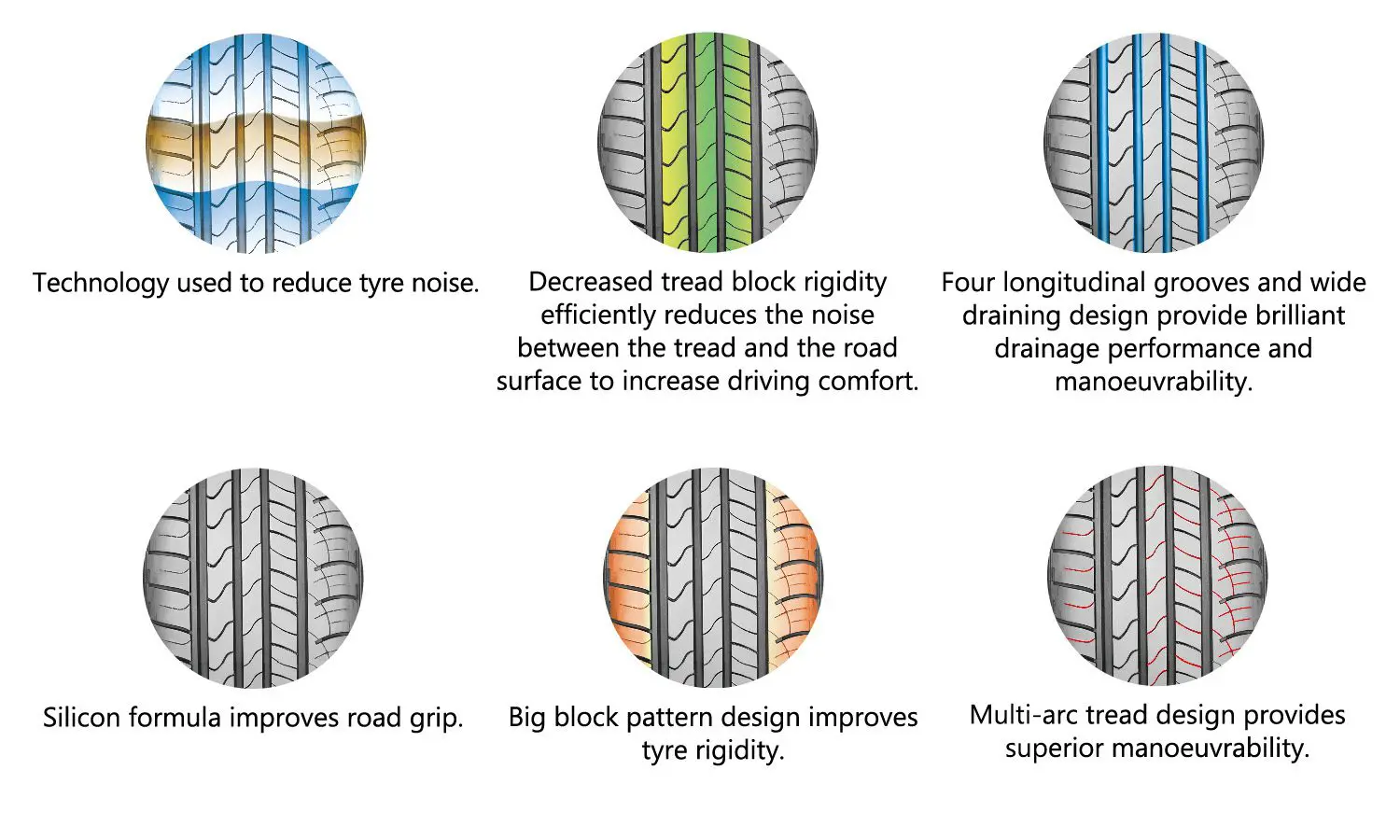 Technology used to reduce tyre noise. Decreased tread block rigidity efficiently reduces the noise between the tread and the road surface to increase driving comfort. Four longitudinal grooves and wide draining design provide brilliant drainage performance and maneuverability. Silicon formula improves road grip. Big block pattern design improves tyre rigidity. Multi arc tread design provides superior maneuverability.