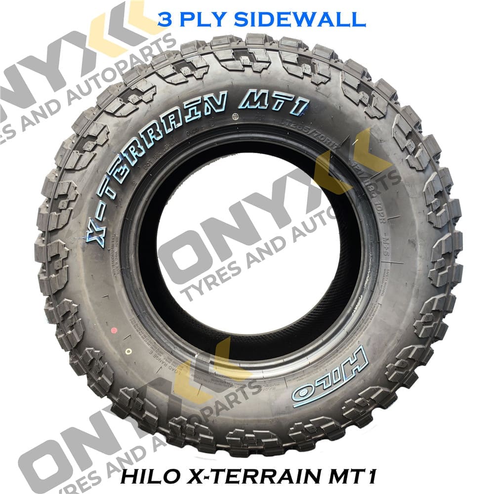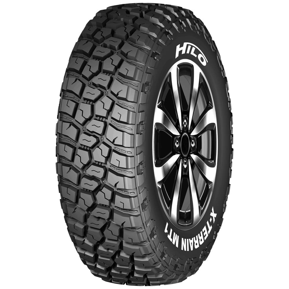 HILO X-TERRAIN MT1 3 PLY SIDEWALL Optimized tread formula design provides ultra-strong traction performance and puncture resistance. Shoulder Design Shoulder Design Open shoulder design with dilated and deepened grooves allows for easier discharge of mud when driving at low or high speeds. Enhanced Performance Enhanced Performance The large block pattern on the shoulder helps to improve driving quality by vastly enhancing performance on muddy and rocky.